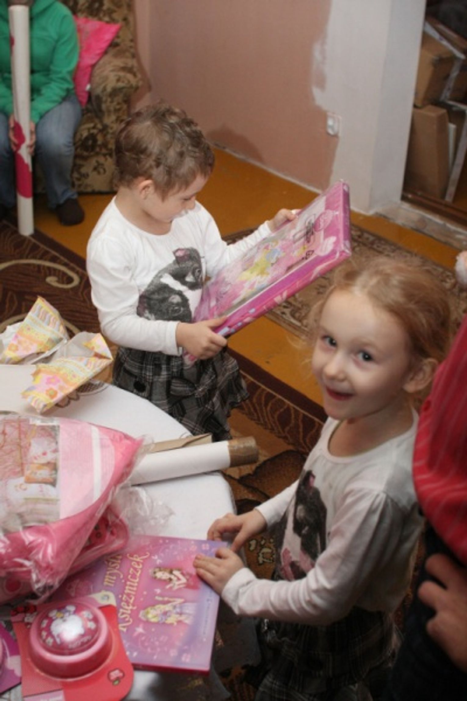 Kasia i jej siostra Karolinka to bardzo spokojne i pogodne dzieci, początkowo były trochę skrępowane obecnością kilkunastu obcych osób w domu. Jednak atmosfera była bardzo przyjazna, powoli więc zaczynały się otwierać. Pierwsze lody przełamały także prezenty. A było ich mnóstwo, wszystko to, co lubi Kasia – lalki, układanki, mebelki do zabawy. Upominki dostała też Karolina.