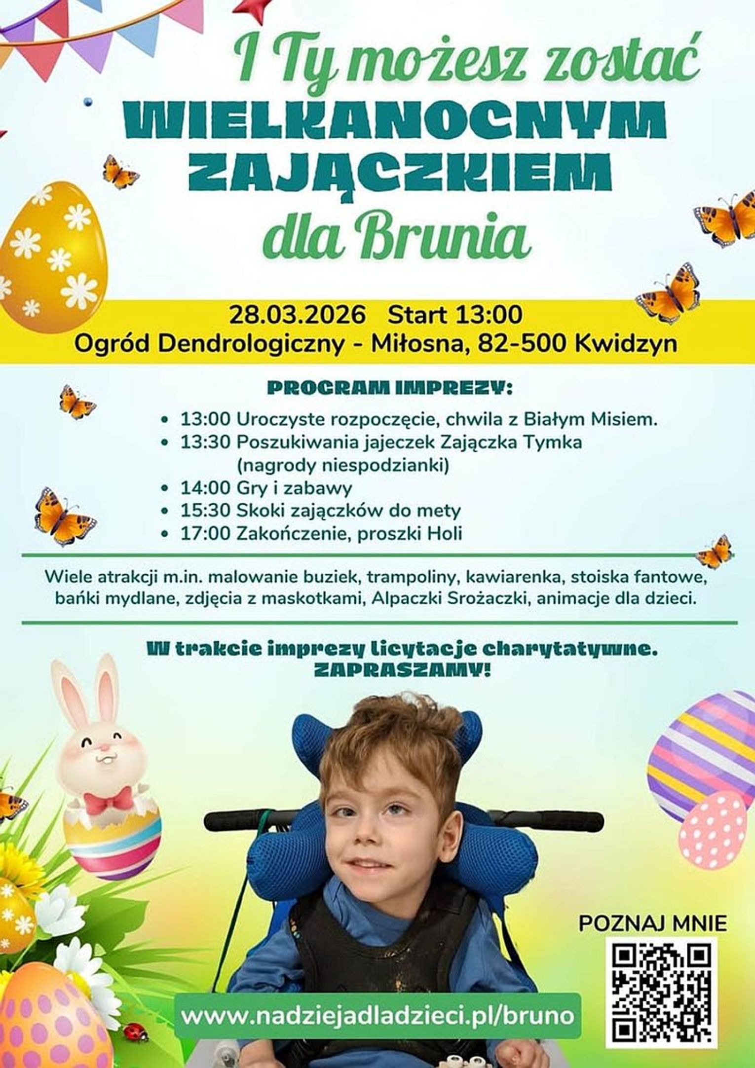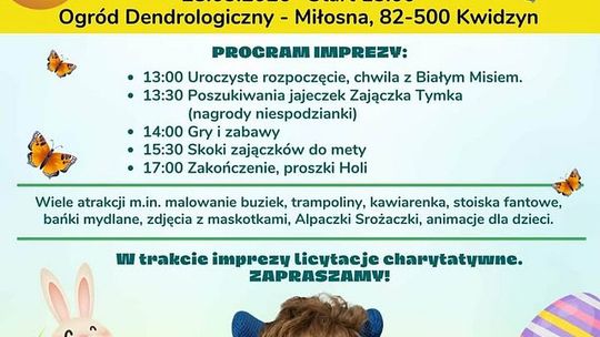 Już w sobotę, 28 marca w Ogrodzie Dendrologicznym w Miłosnej odbędzie się rodzinna impreza charytatywna pod hasłem „I Ty możesz zostać Wielkanocnym Zajączkiem dla Brunia”. Początek wydarzenia zaplanowano na godzinę 13:00. Na uczestników czeka wiele atrakcji dla dzieci i całych rodzin. W programie znalazło się m.in. uroczyste otwarcie z udziałem Białego Misia, poszukiwanie wielkanocnych jajeczek Zajączka Tymka z nagrodami, gry i zabawy oraz „skoki zajączków do mety”.